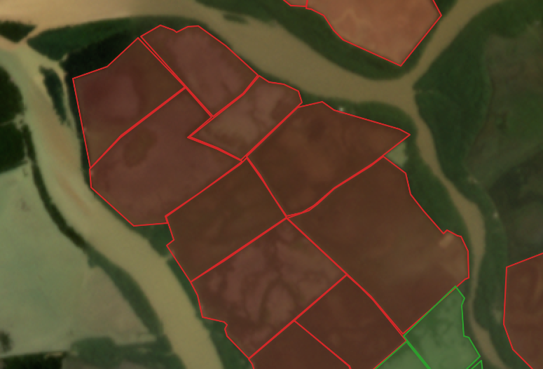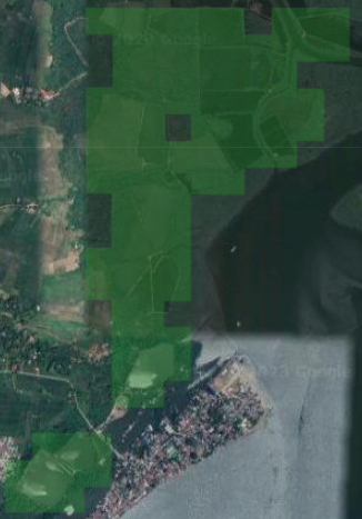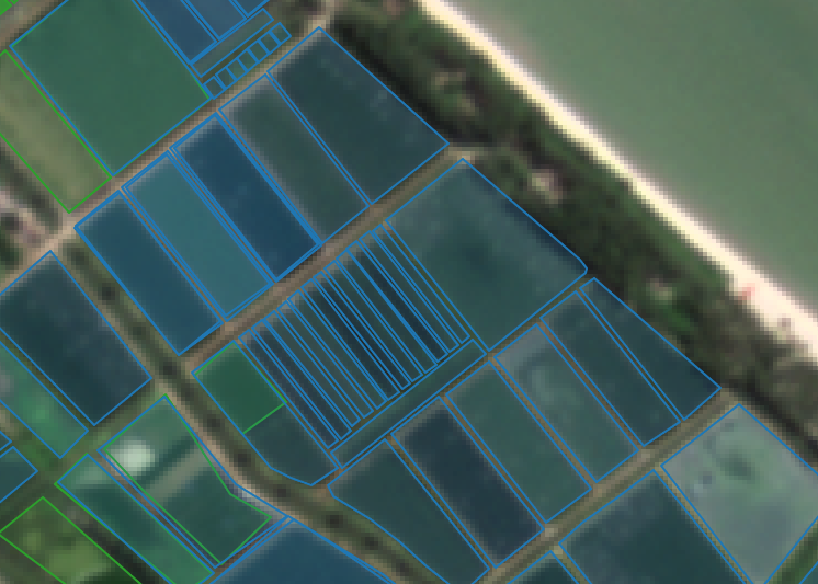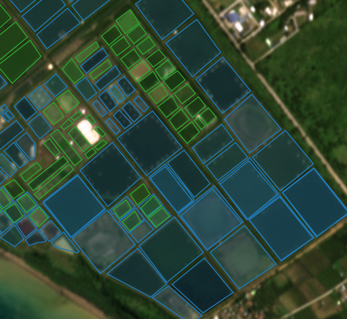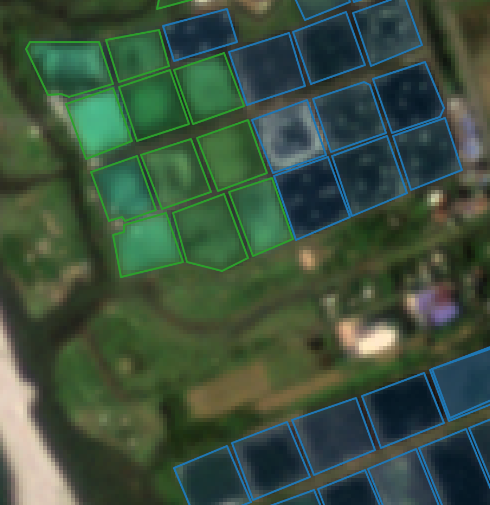 Sample aquaculture area that previously passed the site scoring criteria (left), then later detected further as suitable and unsuitable with the additional ML-generated pond data layer in the criteria (right)